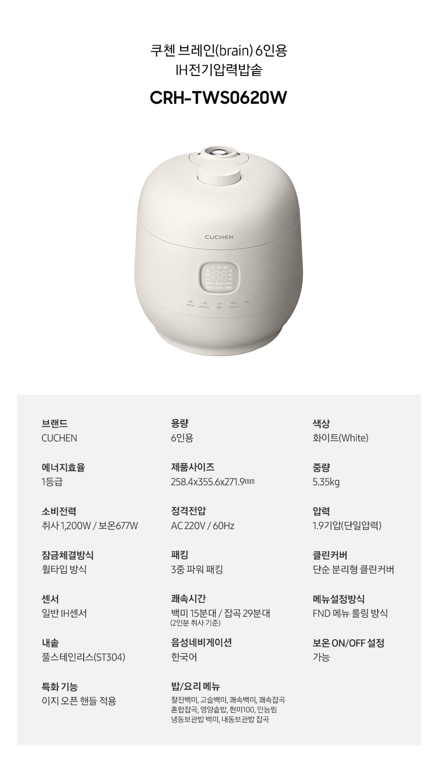 쿠첸 브레인 IH전기압력밥솥 6인용 CRH-TWS0620W 화이트색상