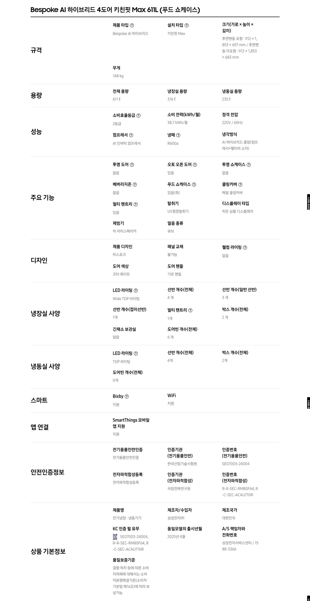 삼성전자 AI 하이브리드 4도어 (푸드쇼케이스) 키친핏 Max 611L RM80F64L2A 삼성물류배달설치