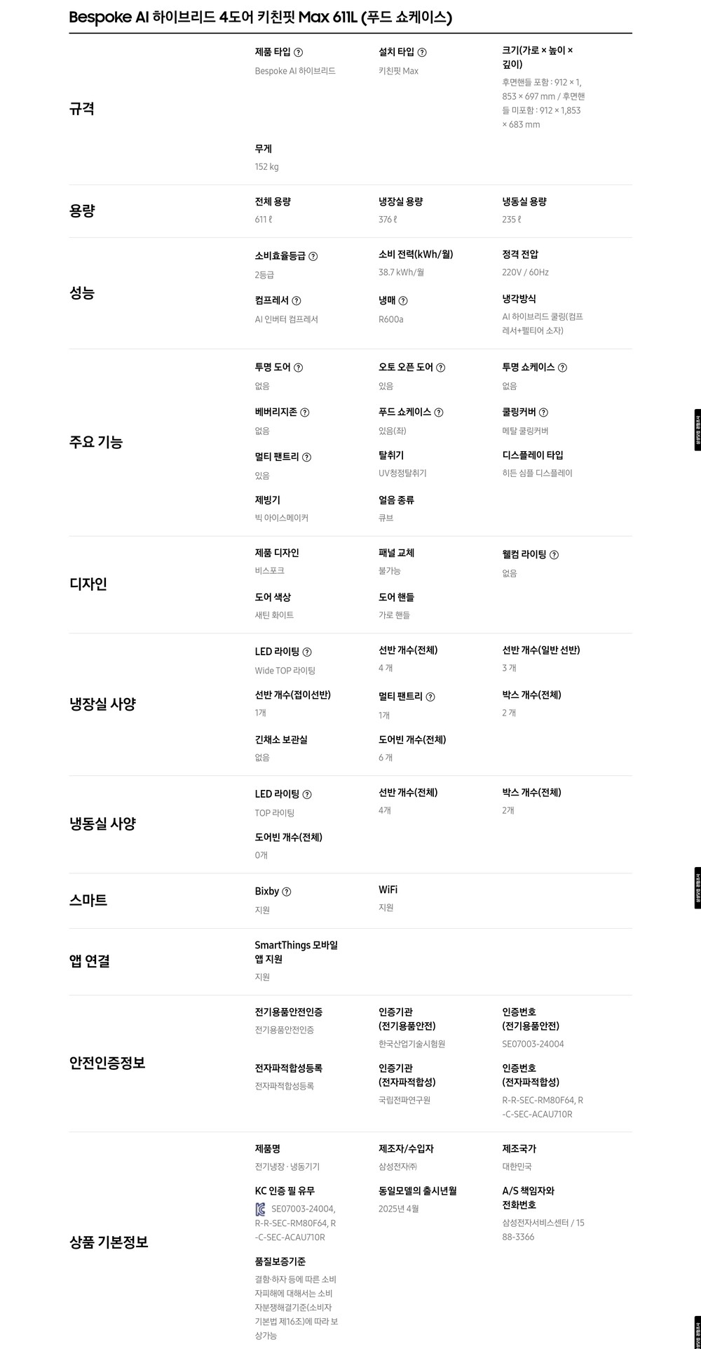 삼성전자 AI 하이브리드 4도어 (푸드쇼케이스) 키친핏 Max 611L RM80F64L2X 삼성물류배달설치