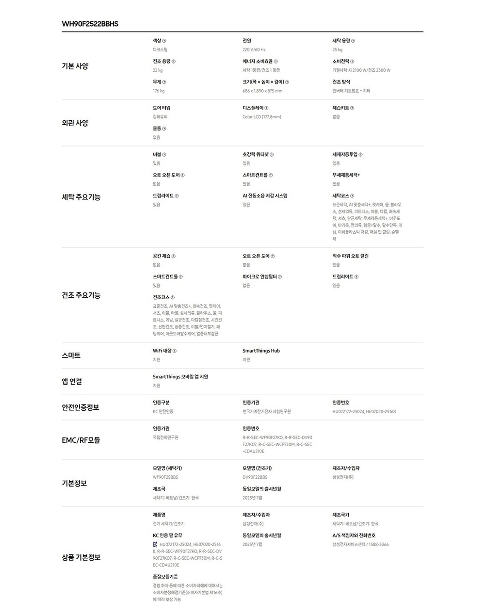 삼성전자 비스포크 AI 원바디 세탁기+건조기 WH90F2522BBHS 25+22KG 로지텍설치